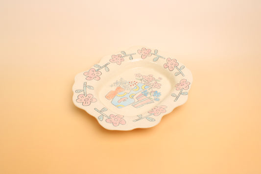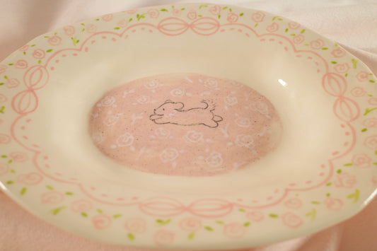 Valentine's Day Gift - Handmade Blush Pink Plate - Tiny Puppy & Roses, Soft Pastel Ceramic Dish