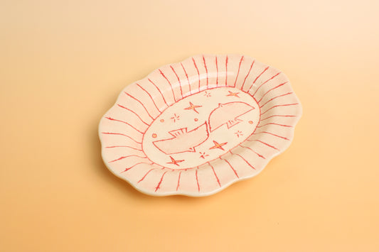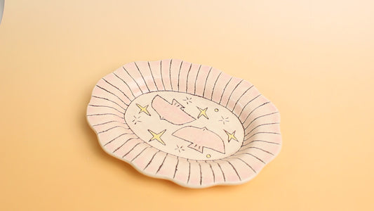 Hand-Painted Black Line Birds Ceramic Dish – Whimsical Pink Scalloped Trinket Plate with Stars