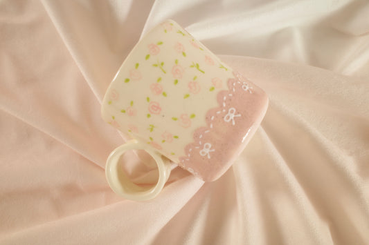 Valentine's Day Gift - Coquette Pink Floral Mug - Hand Painted Roses & Bow Detail, Unique Ceramic Teacup