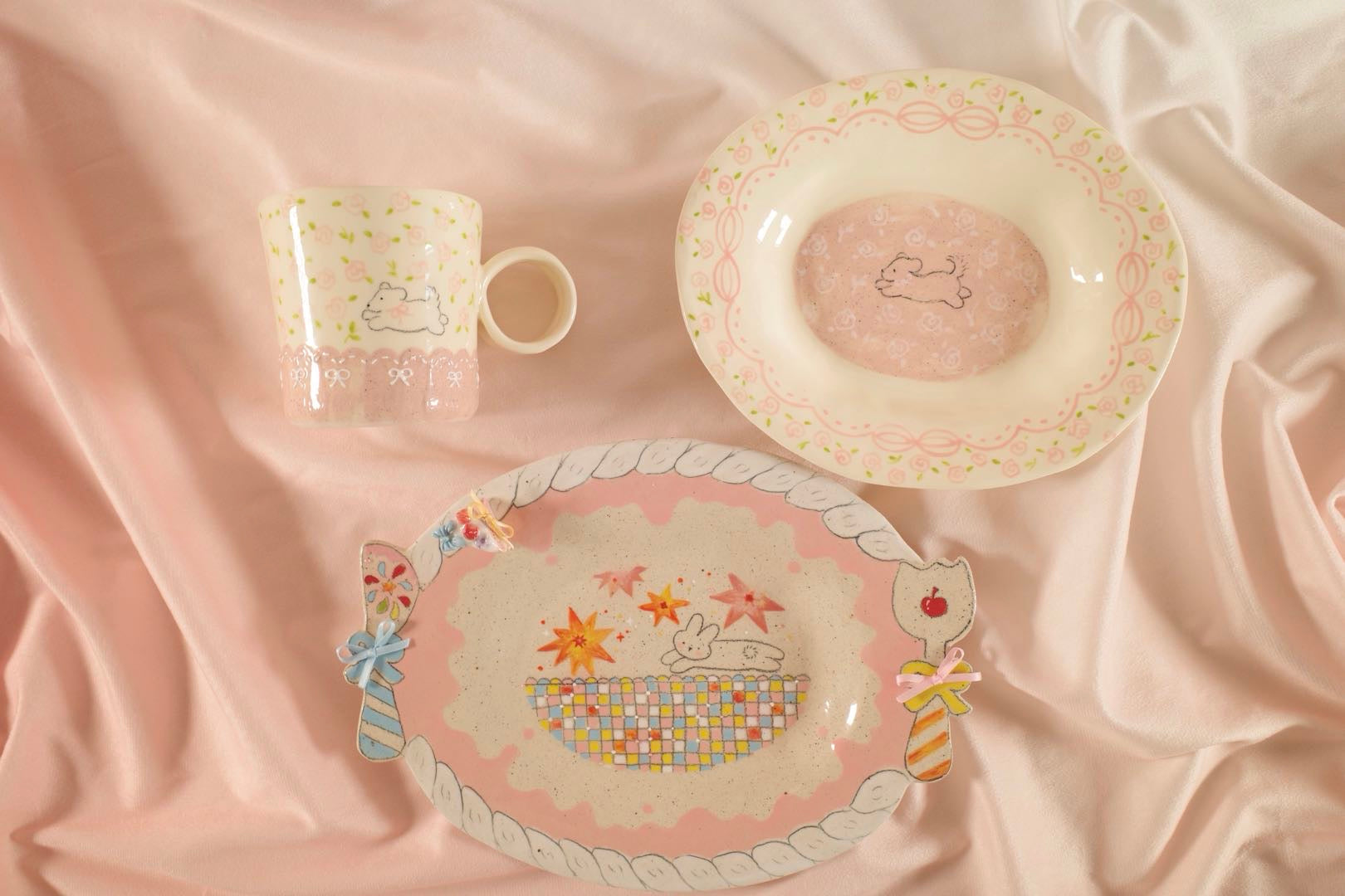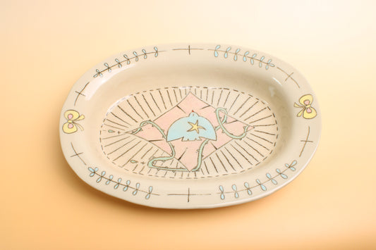 Valentine's Day Gift - Dreamy Pastel Bunny Stars Plate-Oval Ceramic with Colorful Checkered Basket, Coquette Handcrafted Tray